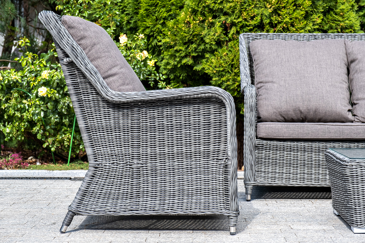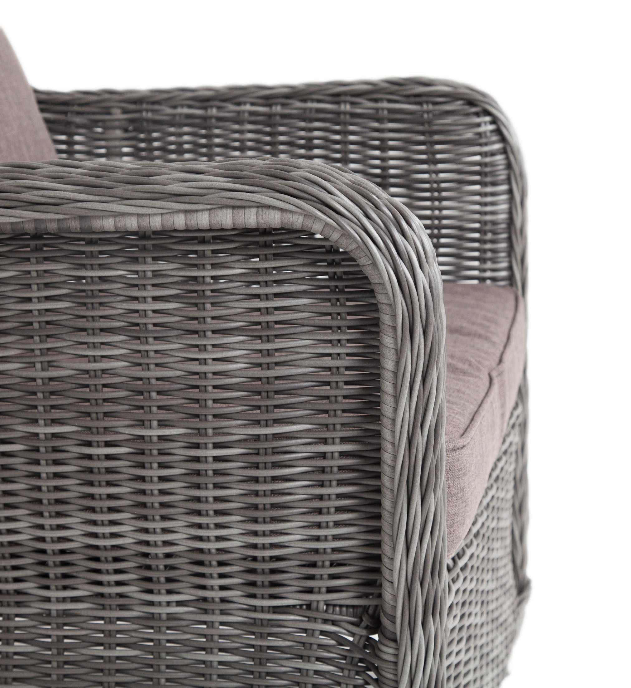 Кресло оснащено каркасом из прочного алюминия, а его оплетка выполнена из круглого ротанга ручного плетения графитового цвета.