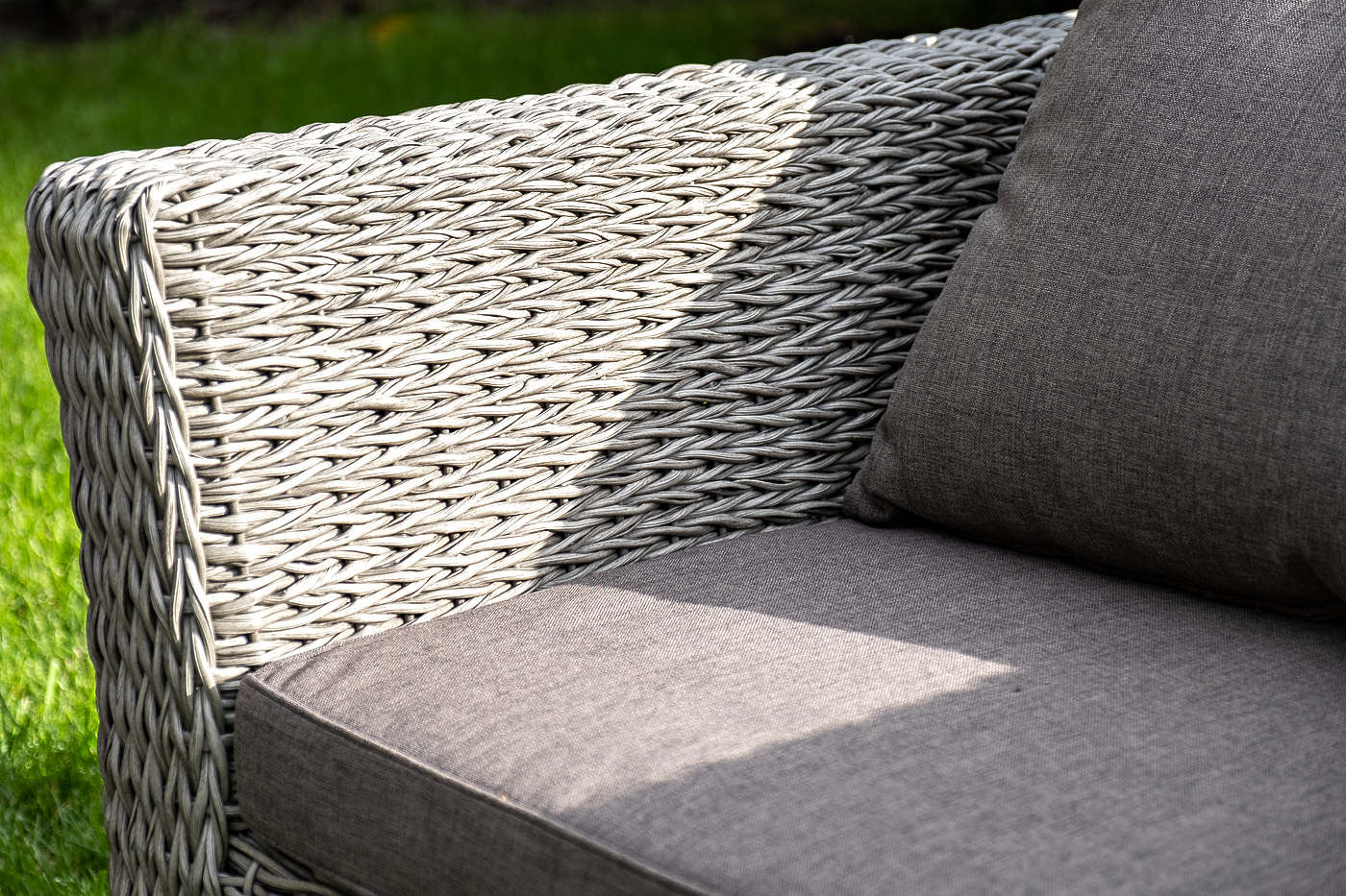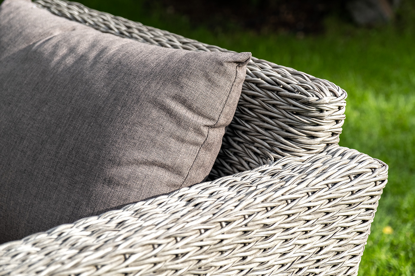 Кресло из искусственного ротанга «Капучино» серого цвета, прекрасно подходит для обустройства веранды, а относительно небольшой вес, который составляет 21,5 кг, увеличивает мобильность данной модели. Плетение используется вида «гиацинт».