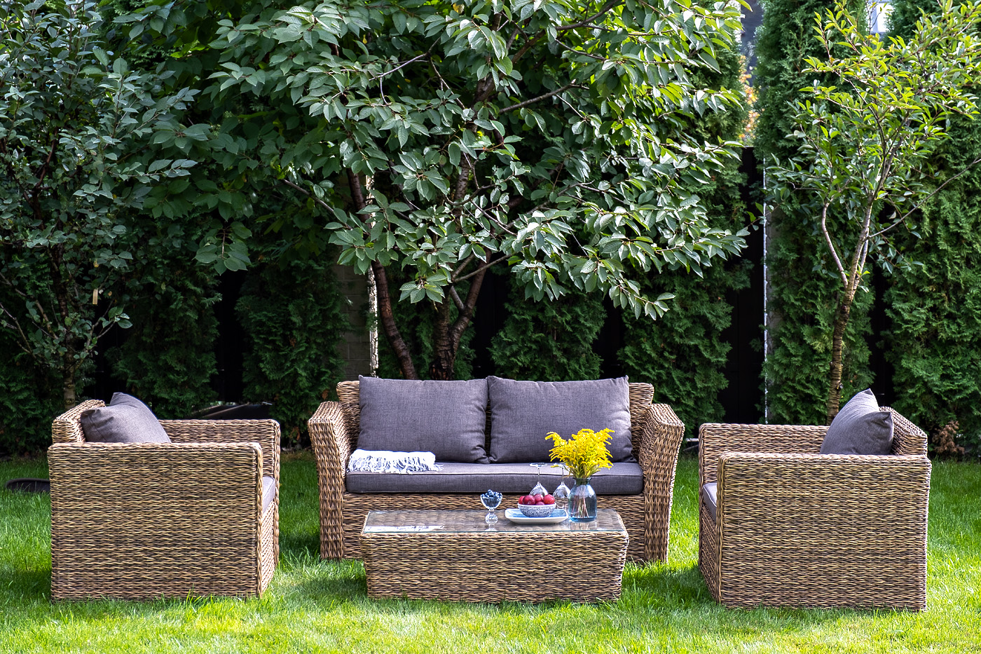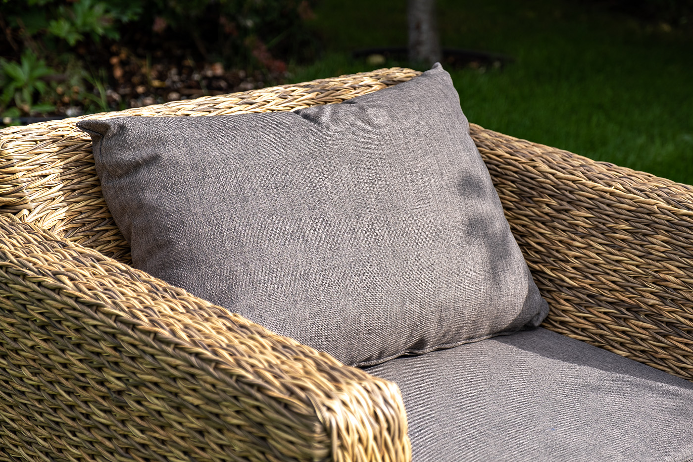 Каркас изготовлен из прочного алюминия, оплетенного вручную искусственным ротангом вида «гиацинт» соломенного оттенка.