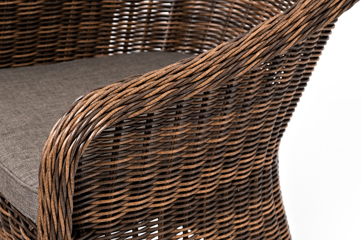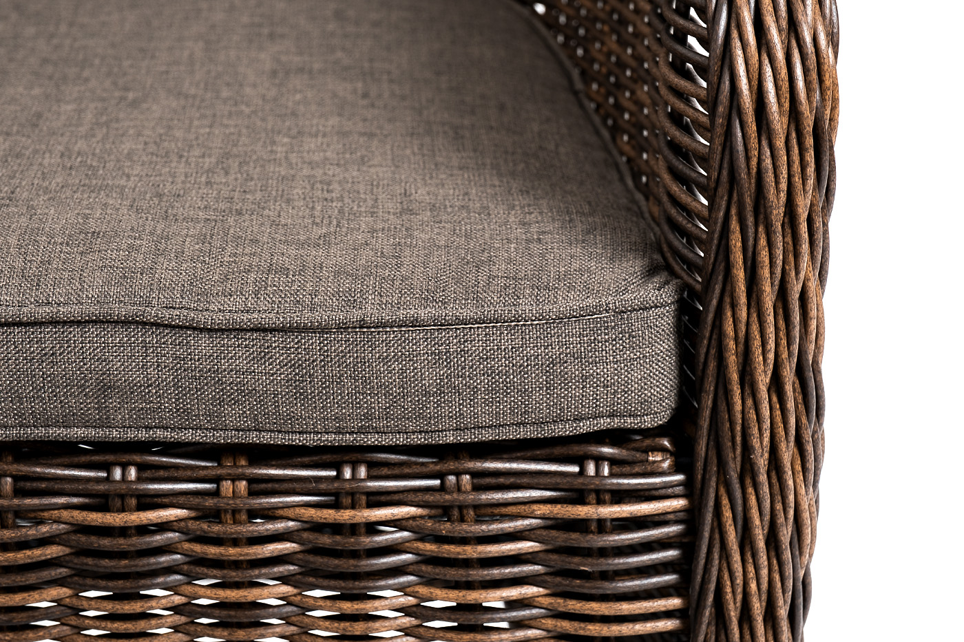 Комплект выполнен из круглого искусственного ротанга коричневого цвета. Каркас - из легкого и прочного алюминия. Подушки со съемными чехлами - из 100% полиэстера, плотностью 230гр/м2 с влагоотталкивающей пропиткой.