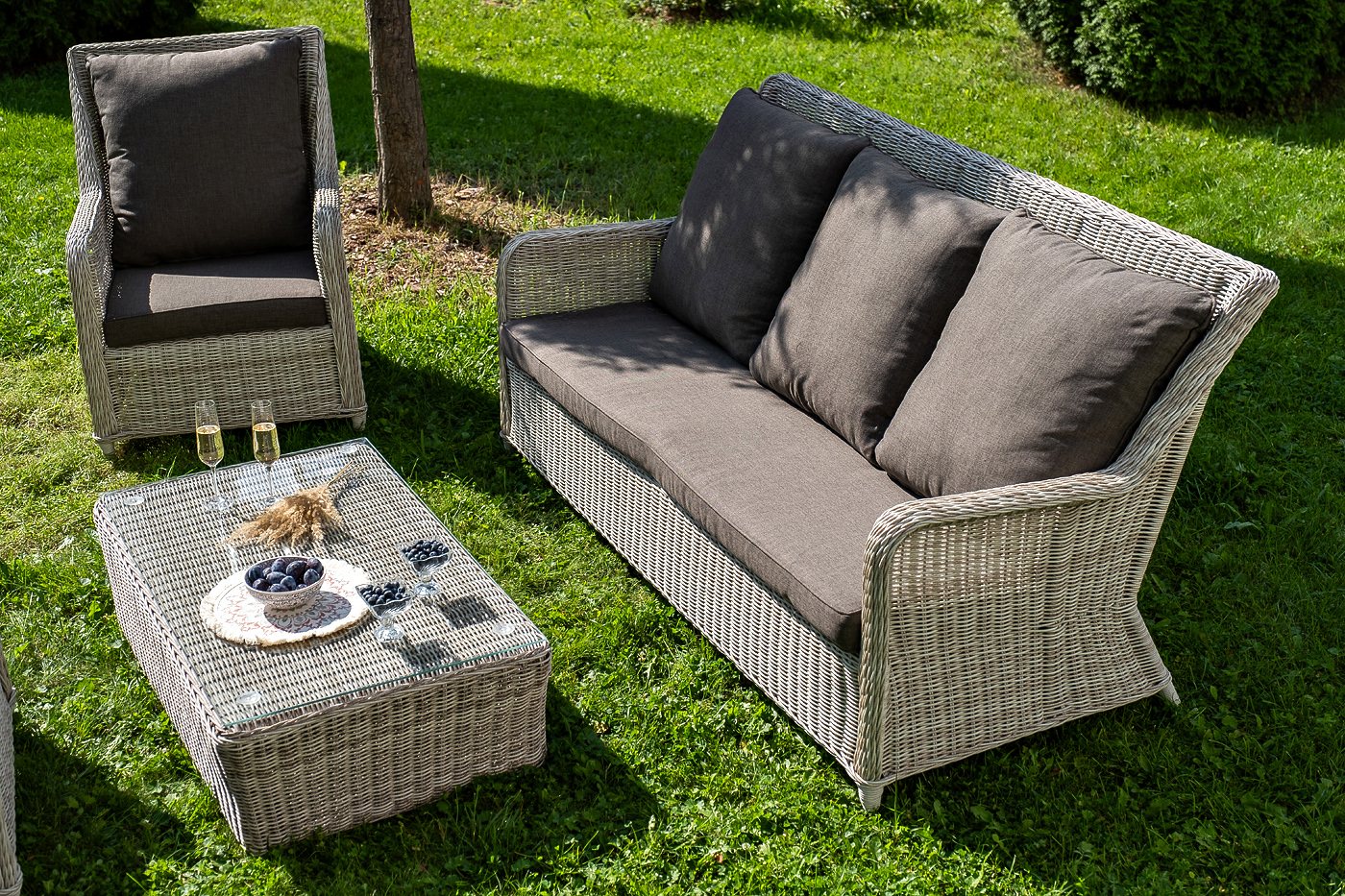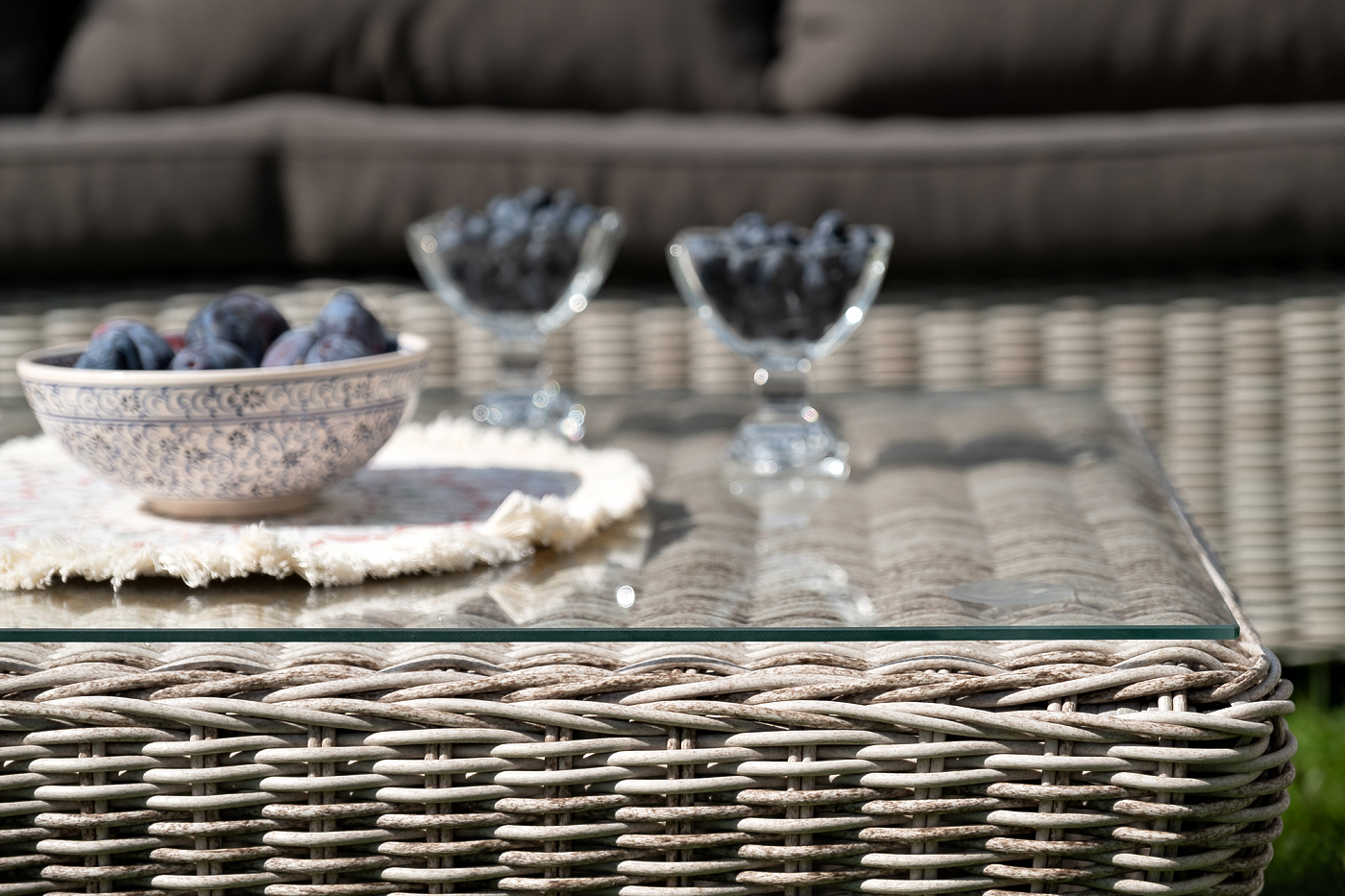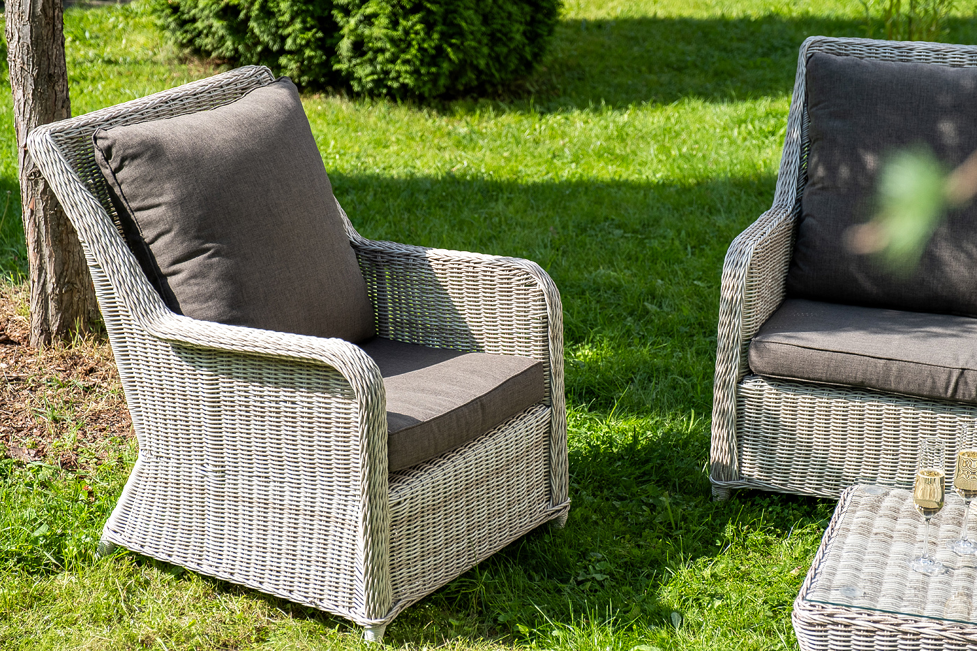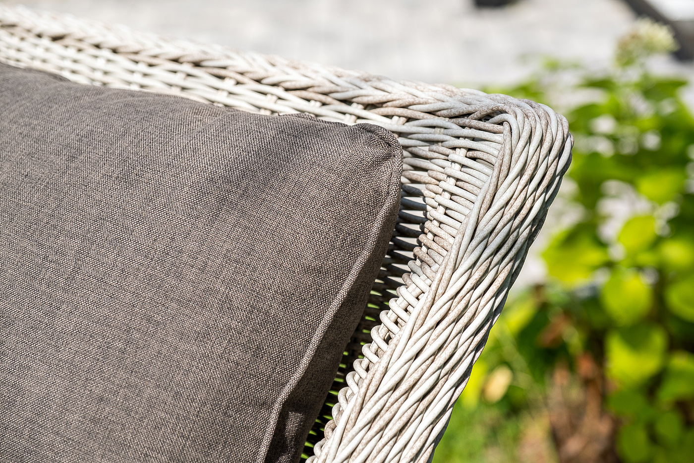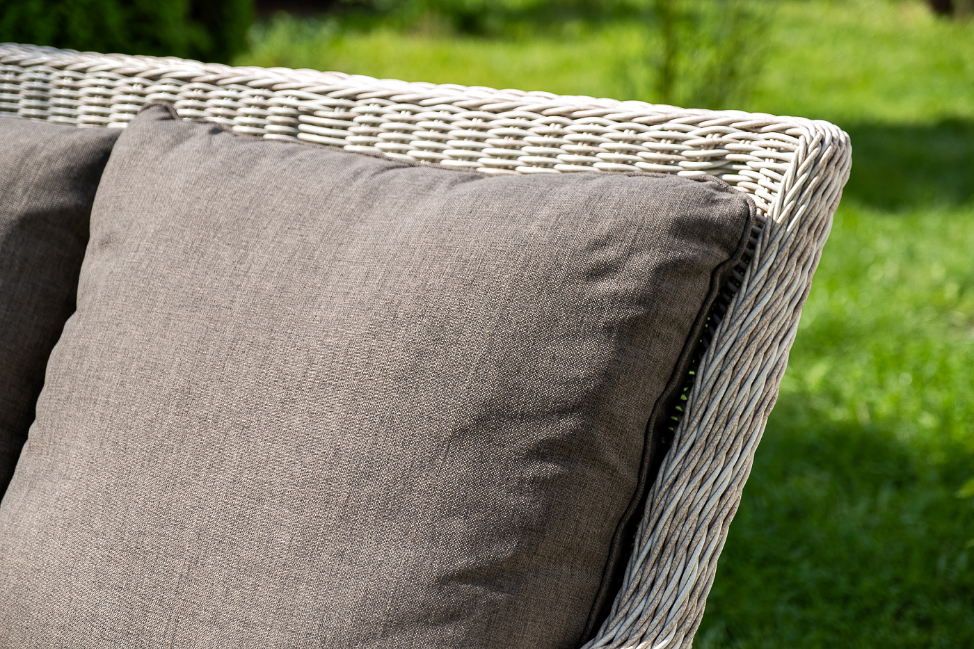 Плетеная мебель дополнена удобными подушками в серо-коричневых чехлах. При их изготовлении используют полиэстер, плотность – 230гр/м2. Он обрабатывается влагоотталкивающей пропиткой для повышения защитных свойств материала.