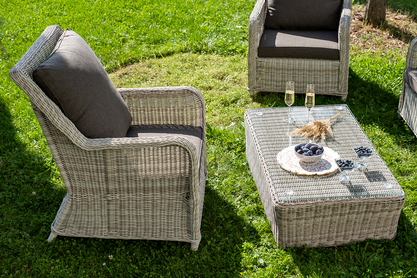 Модели имеют алюминиевый каркас, который оплетен вручную искусственным ротангом бежевого цвета.